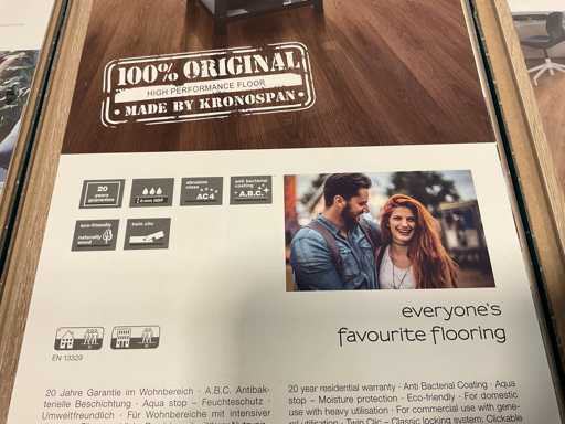 Click laminate – 2.22 m² per pack. Contents per pack: 9 planks of 1285 × 192 × 8 mm. https://pennyshop.ba/shop/proizvod/krono-orginal-laminat-ac4-8072/141003 https://www.webba.hu/Laminalt-parketta-8-mm-Krono-Original-Castello-807