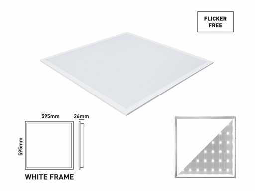 luminous flux 4600 lumens, fliker-free, light color warm white 3000K, sealing IP20, radiation angle 120°, product color matte white, dim. 595 x 595 x 26 mm, material aluminum, mounting set not included, lifespan 25,000 hours, voltage 220-240V, sku 999
