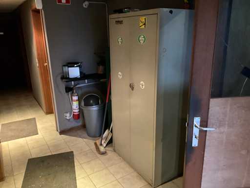 Includes wall bracket, as well as metal filing cabinet 90x45x180cm, including contents, metal cabinet 35x35x142cm, both without key, waste bin and coffee maker
