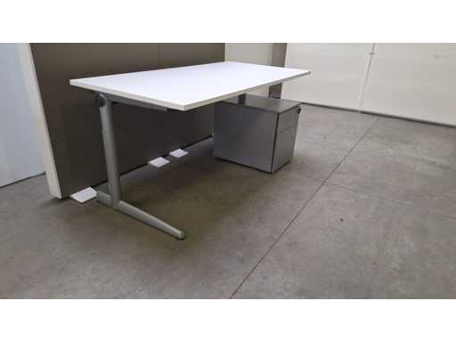Height-adjustable base in metal color Alu, worktop in melamine color White, matching drawer unit in metal color Alu equipped with 1 regular drawer + 1 file drawer, light signs of use possible
