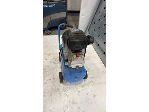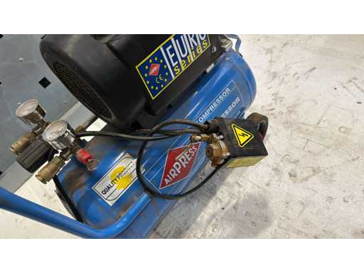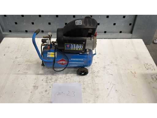 Airpress Euro Series Compressor – with boiler; Mobile electric compressor on horizontal air receiver; Equipped with carrying handle; wheels and 2 pressure gauges; Compressed air line/connector at compressor has broken off – no coupling present; Used condition with normal wear and soiling; CE marking and type plate visible.