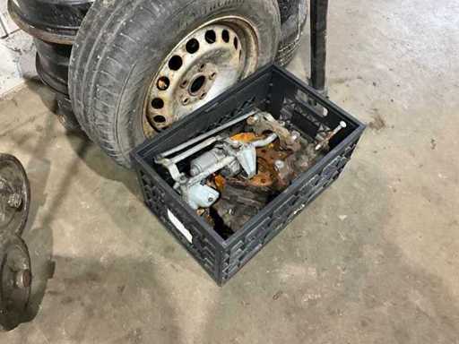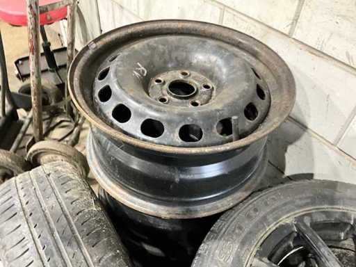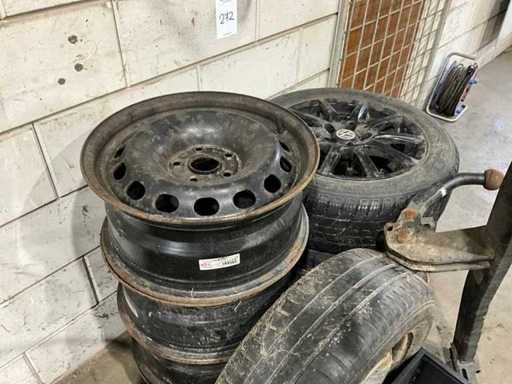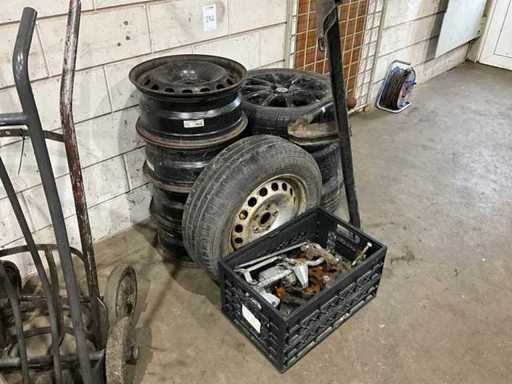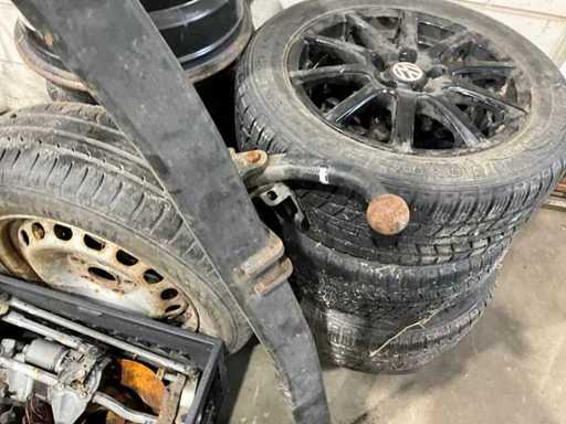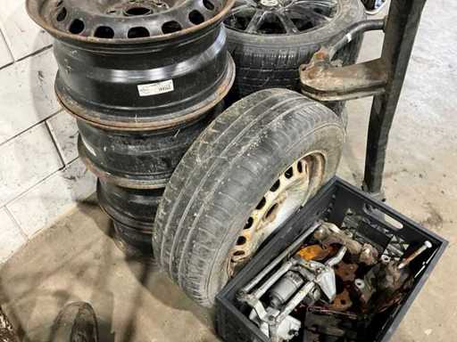 4x steel rim, 1x steel rim with tire, 3x Alloy rim with tire 205/55R16, including towbar bracket and various car parts