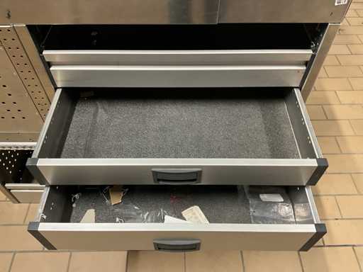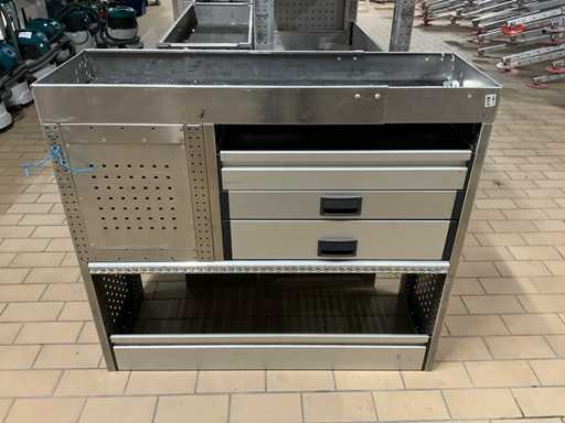 Dimensions: H105xL199xD32cm and H105xL120x42cm; 1x van racking with 2x drawer and various plastic storage bins