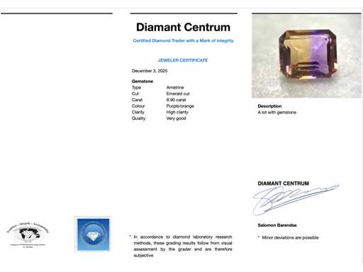 Gemstone: Ametrin; Quantity: 1 piece; Cut: Emerald cut; Weight (carat): 8.90 carat; Color: Purple/ orange; Purity: High purity; Cut quality: Very nice; Condition: New; Packing: Gem Box; Explanation: The quality has been taken from the report belonging to the item. The valuation is an assessment of a certified diamond dealer, based on consumer prices; Consumer price: € 2,000