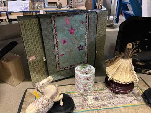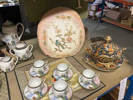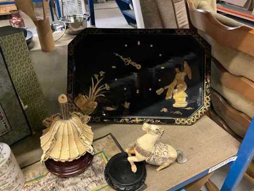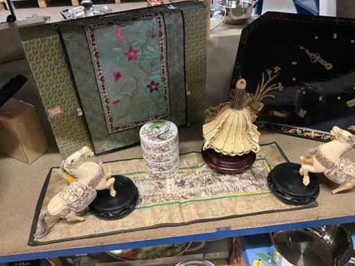 Including Chinese complete tea set in fine porcelain, Chinese tureen, Chinese antique pots, Chinese clock in lacquering, various statues and miscellaneous ...