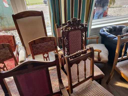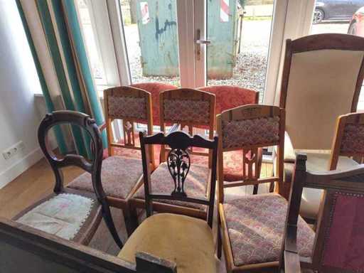 • three antique wooden chairs, upholstered in fabric;