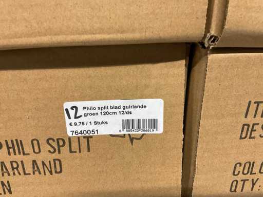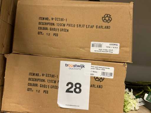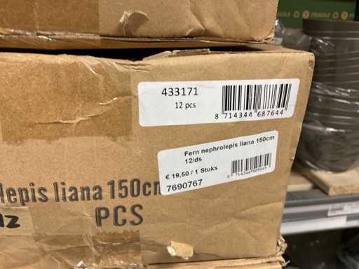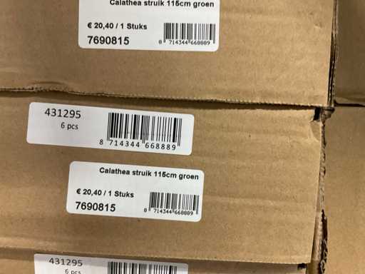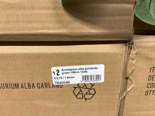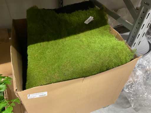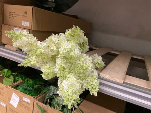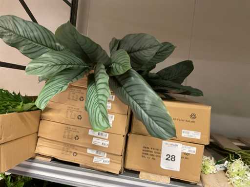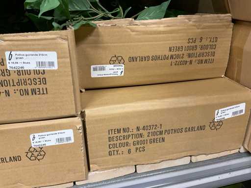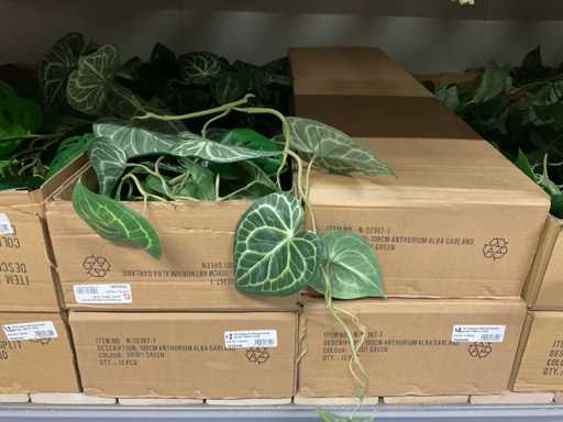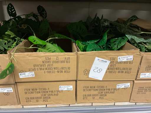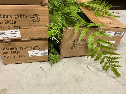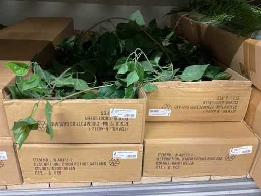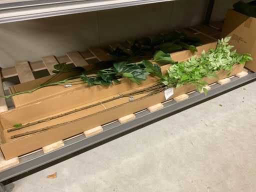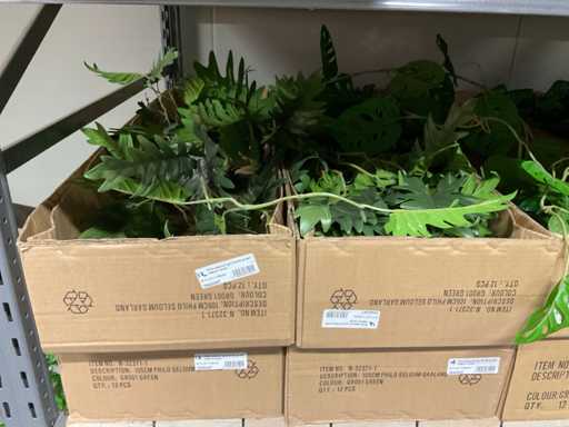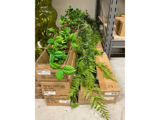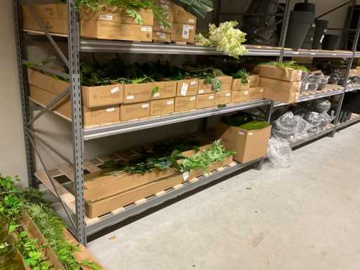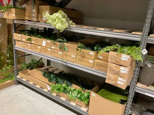 Contents section pallet rack with various boxes of artificial branches, leaves and moss mats