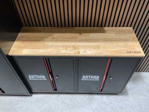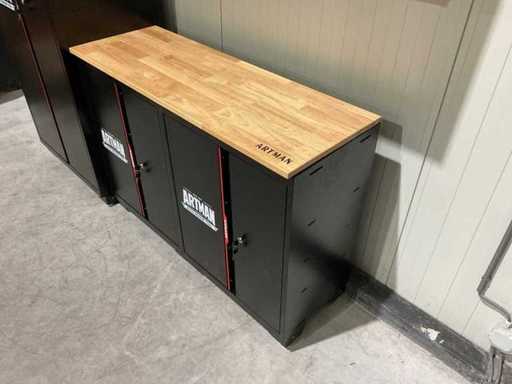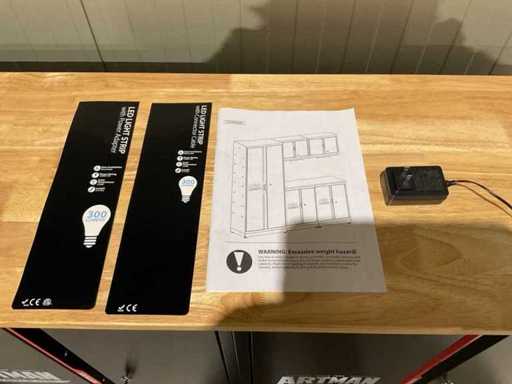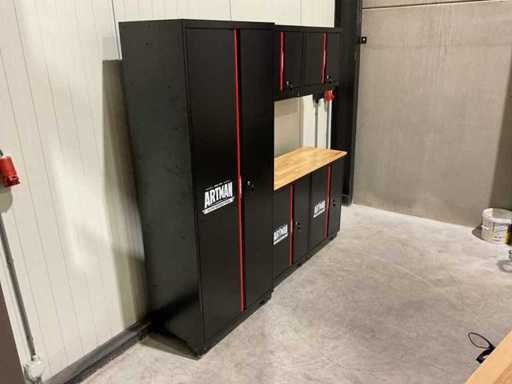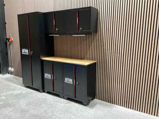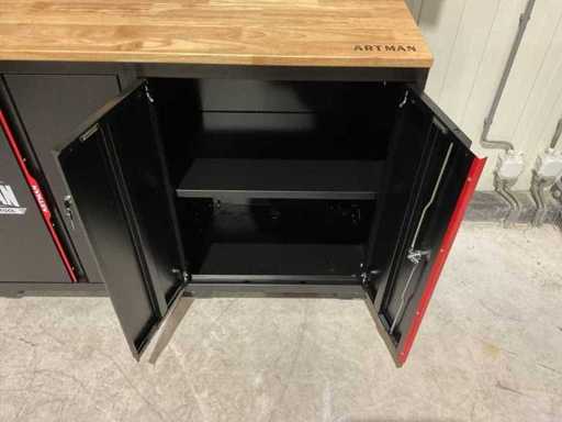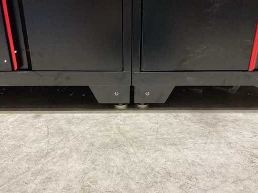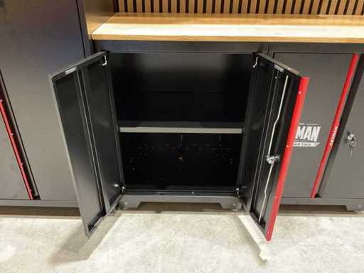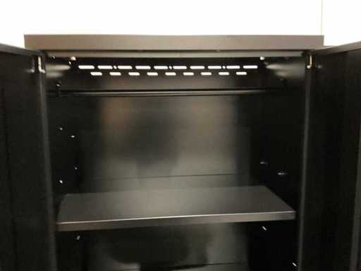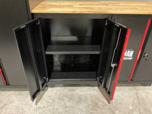 Equipped with High column cabinet (left); Wall cabinets (wall cabinets); Base cabinets; Solid wood worktop; Modular system (can be placed / combined separately); Steel construction; Powder coating (black); Lockable doors (cylinder locks); Transport weight: 83.4 kg; Transport dimensions: 77.5x47x183 cm; Unused in box