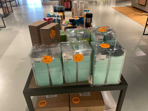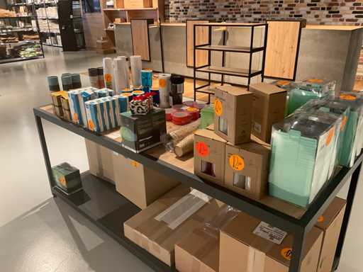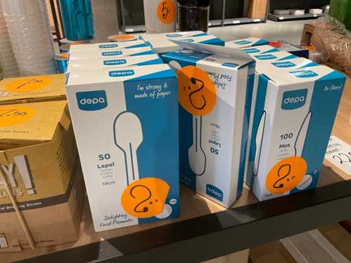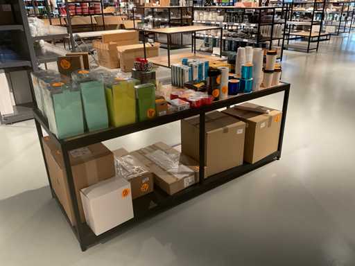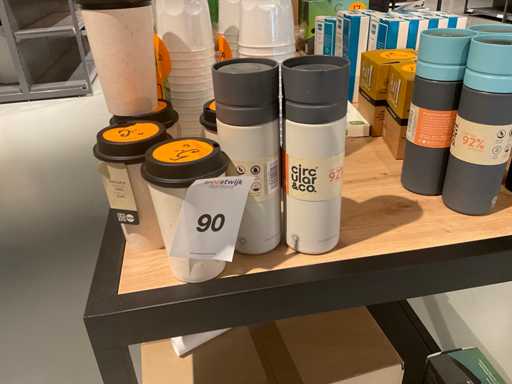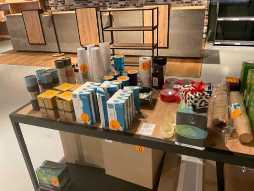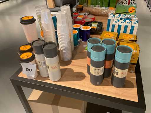 Contents on the table, consisting of cups, stirrers, haberdashery bags, candles, bonbon boxes and window bags.
