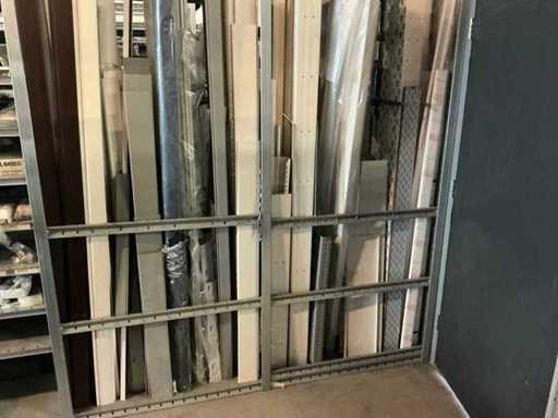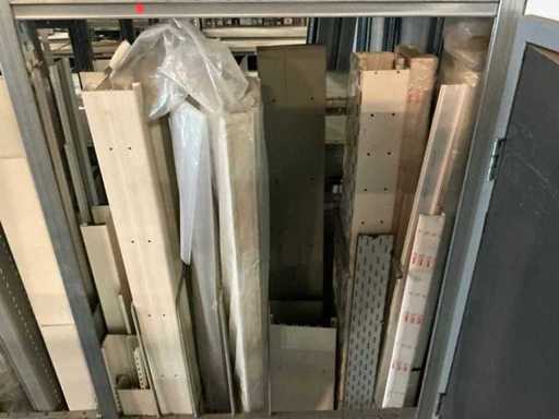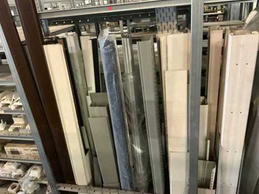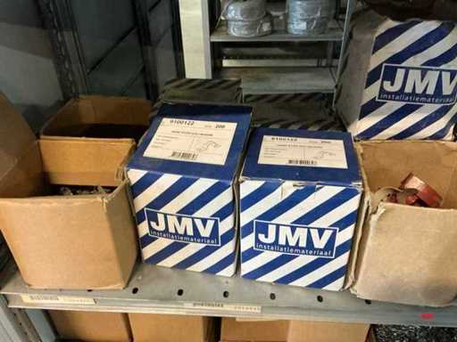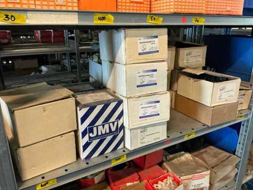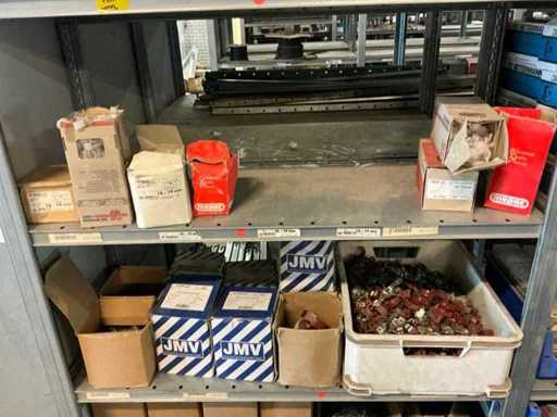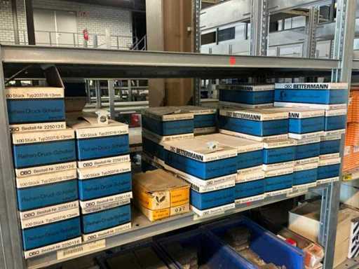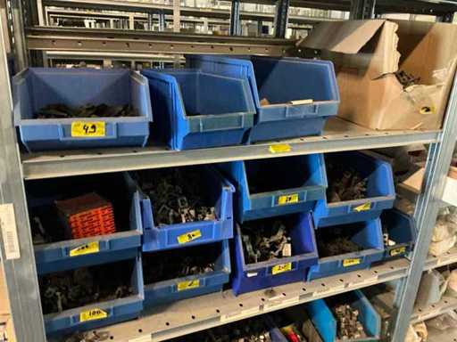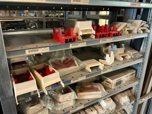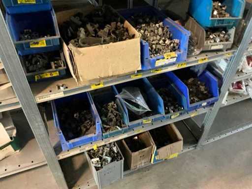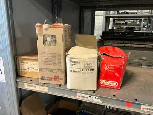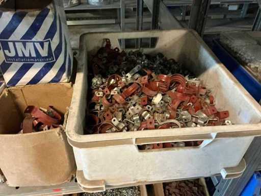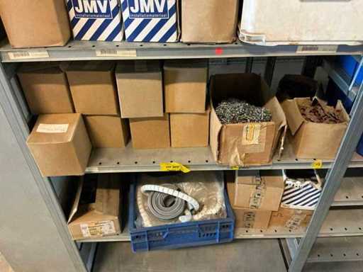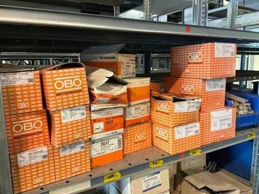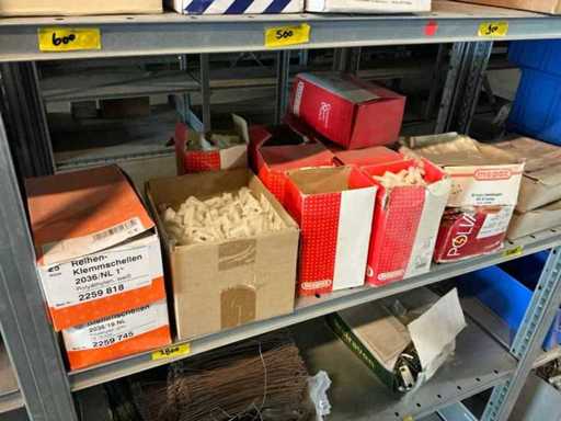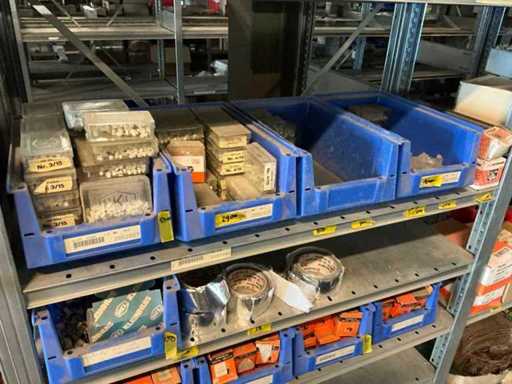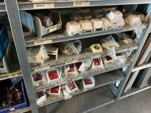 Contents shelf rack consisting of, among other things: plugs, cabal saddles, and plastic cable ducts. Rack not included.