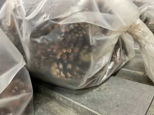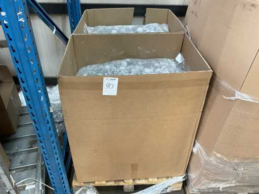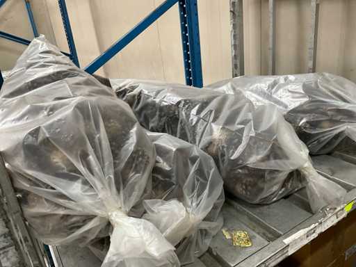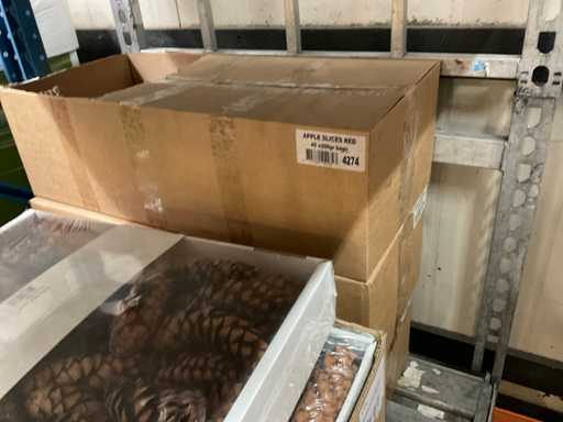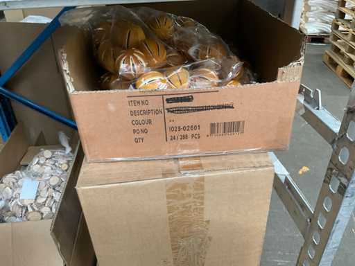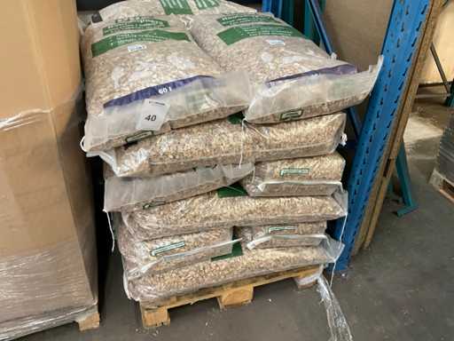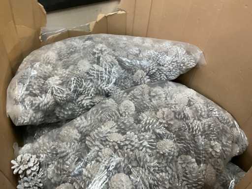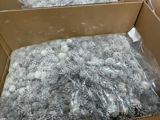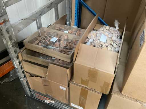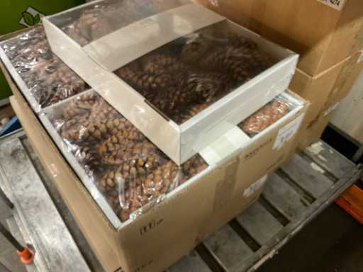 Contents part of 2 carts 3 pallets consisting of pine cones, wood chips, and decoration materials, excluding carts and including pallets.
