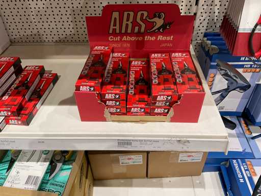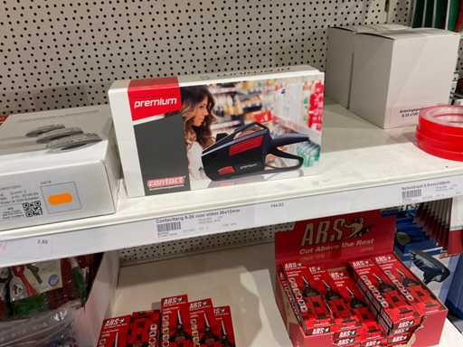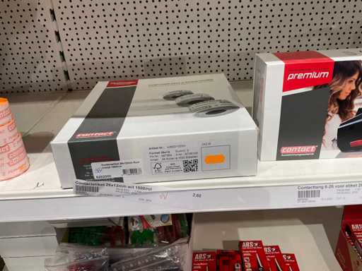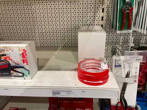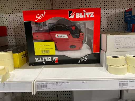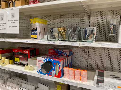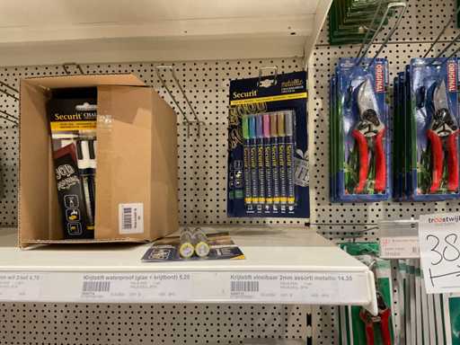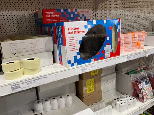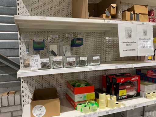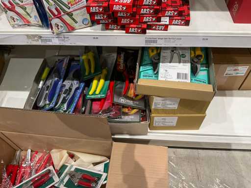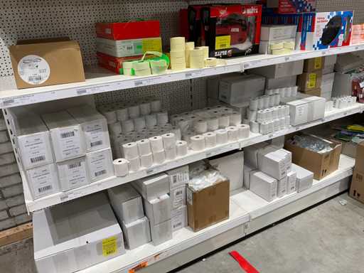 Contents of 5 shelves consisting of cash register rolls, price iron, pruning shears, felt-tip pens.