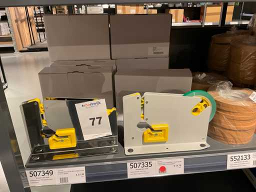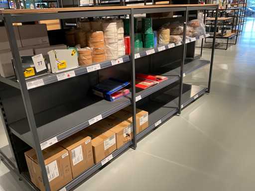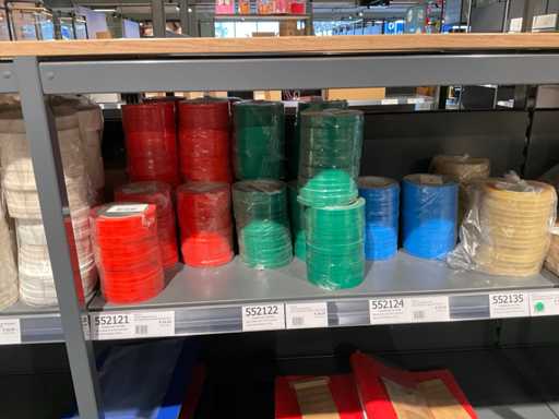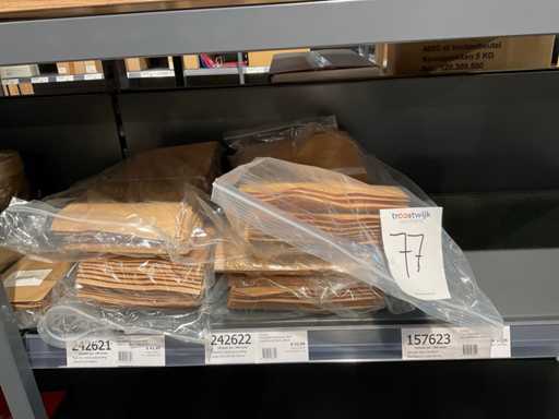 Contents of 1 side of rack consisting of tape, bag closure and holder, block bottom bags, paper stand-up pouches, excluding rack.