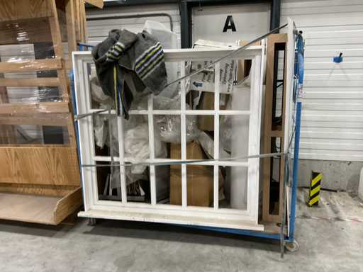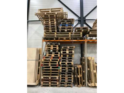 Various types of pallets (approximately 70x), (7x) wooden transport frames, (2x) rack part, (1x) furniture transport trolley with frame, etc.