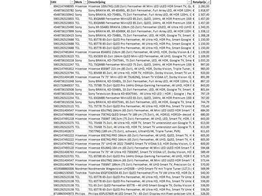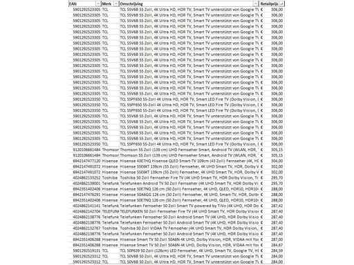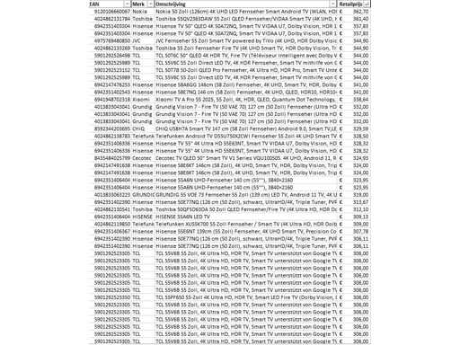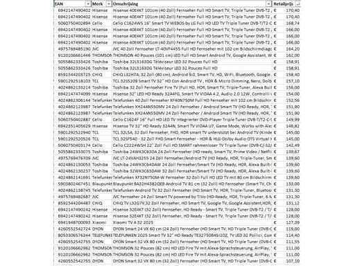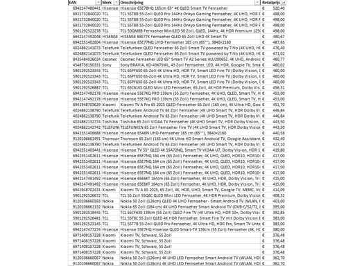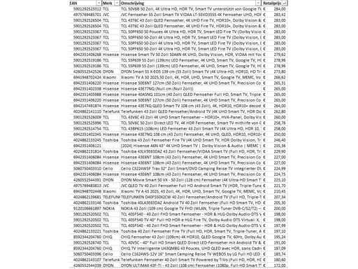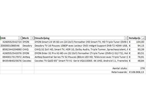 This concerns a batch of television returned goods from a large online retailer. The party consists of televisions. Number of pieces: 276. Retail value: €106,906 Unchecked: The televisions are not working and it consists of a mix of incomplete, damaged, usable for parts. Come on the viewing day to get a good idea of the reason for return. See link for list of contents: