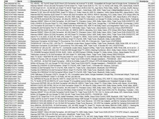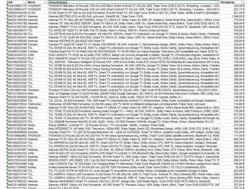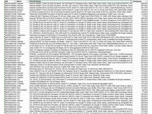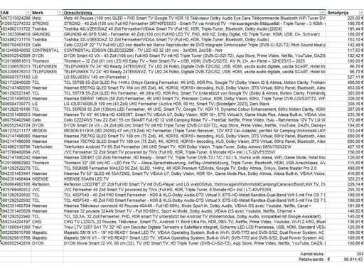 This concerns a batch of television returned goods from a large online retailer. The party consists of televisions. Number of pieces: 304. Retail value: €96,914 Unchecked: The televisions are not working and it consists of a mix of incomplete, damaged, and useable