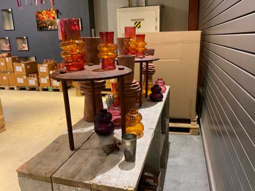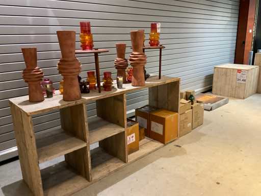 Contents on scaffolding wood furniture and boxes, consisting of glass mushrooms and vases, excluding furniture.