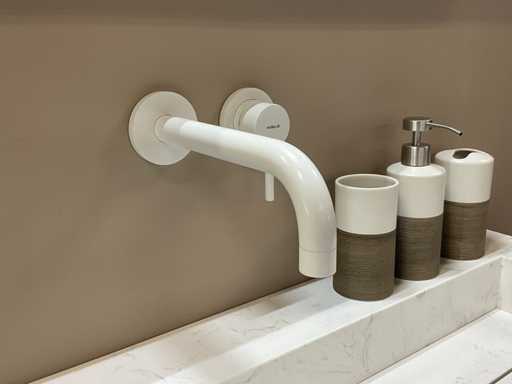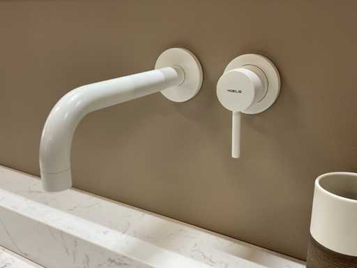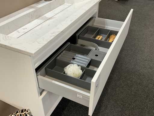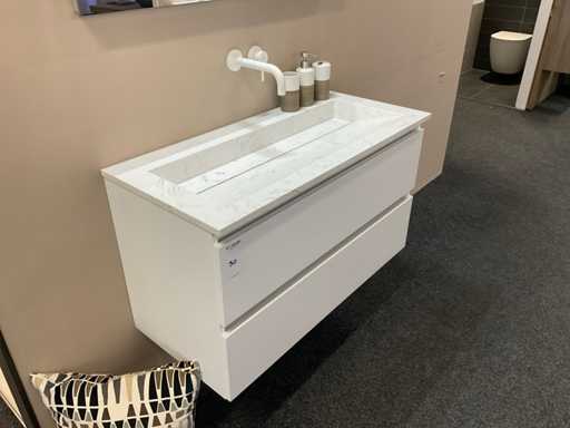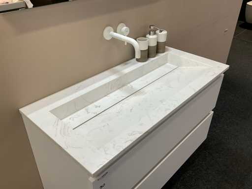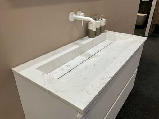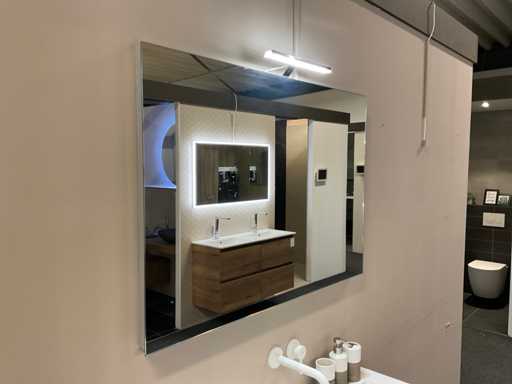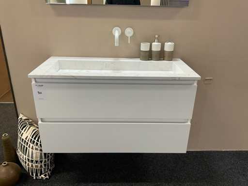 equipped with base cabinet with 2 drawers and organizers; color matte white; Urano washbasin without tap hole; basin faucet; color matte white; mirror with deliberate LED lighting; size approx. 100x70 cm