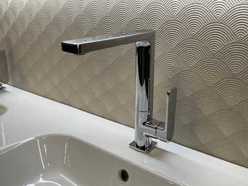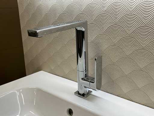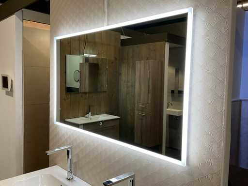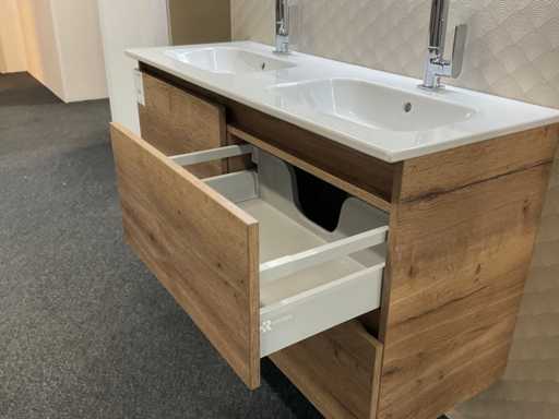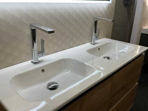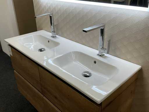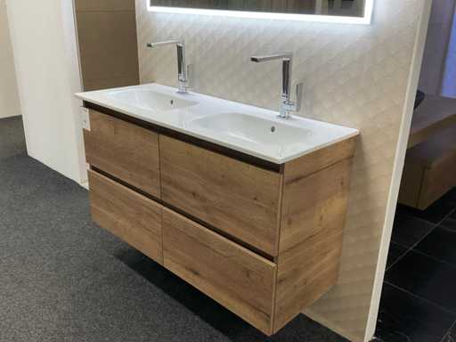 equipped with base cabinet with 4 drawers; double sink; 2x single-lever mixer tap; mirror with deliberate LED lighting; size approximately 120x70 cm