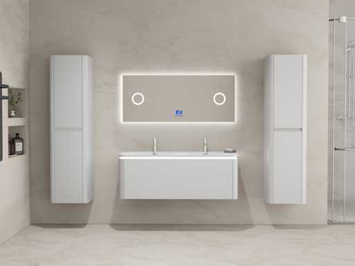 Type: BOSTON1201-WH. Dimensions Complete set: 1 * Vanity unit - 1200x455x400mm, 1 * Double sink - 1205x460x190mm, 2 * Side cabinet - 1500x350x350mm, 1 * Mirror- 1200x600mm. Equipped with: LED lighting in base cabinet - 2 taps including pop-up drain - 1 drawer with 2 storage compartments - Soft close drawer system - LED mirror with anti-fog system - Pre-assembled side cabinets and washbasin furniture.