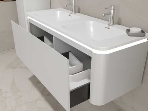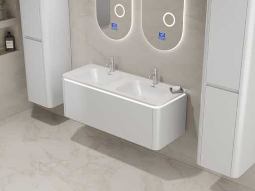 Type: BOSTON1202-WH. Dimensions Complete set: 1 * Vanity unit - 1200x455x400mm, 1 * Double sink - 1205x460x190mm, 2 * Side cabinet - 1500x350x350mm, 2* Mirror- 450x900mm. Equipped with: LED lighting in base cabinet - 2 taps including pop-up drain - 1 drawer with 2 storage compartments - Softclose drawer system - LED mirrors with anti-fog system - Pre-assembled side cabinets and washbasin furniture.