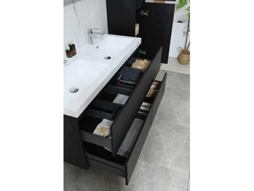 Type: 9015. Size: 3-piece set: 1 * Vanity unit - 1200x450x600mm, 1 * Side cabinet - 1500x350x350mm, 1 * Mirror- 1200x600mm. Equipped with: Faucets including pop-up drain - 4 sturdy metal drawers - Soft-close drawer system - LED mirror with anti-fog system - Pre-assembled side cabinet and washbasin.
