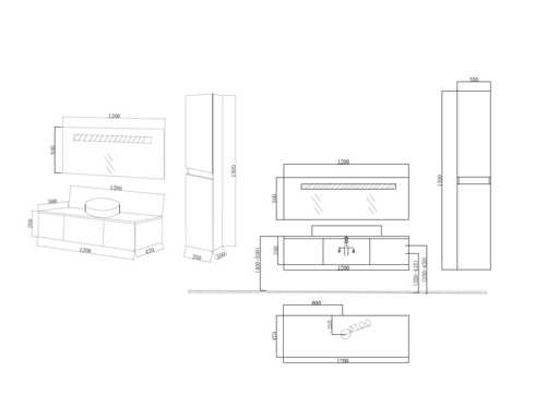 Type: BL-9009-120-M030. Size: 4-piece set: 1 * Vanity unit - 1200x470x250mm, 1 * Washbasin - 590x385x190mm, 1 * Mirror - 1200x500x60mm, 1 * Side cabinet - 1500x350x350mm. Equipped with: Mirror with touchscreen LED lighting and anti-fog technology - Faucets including pop-up drain - Soft close drawer system - Ceramic washbasin - Pre-assembled washbasin.