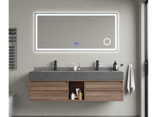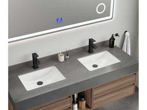 Type: MBY-415-WM. Dimensions: 2-person set: 1 * Vanity unit - 1500x550x430mm, 1 * Mirror - 1500x35x700mm. Equipped with: Softclose drawer system: 4 sturdy metal drawers - Black taps including pop-up drains (chrome) - Mirror with: touchscreen LED lighting in 3 colors, dimmable, digital clock + thermometer, Bluetooth + speakers, anti-fog technology, copper free - Pre-assembled washbasin furniture.