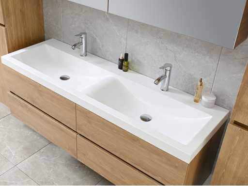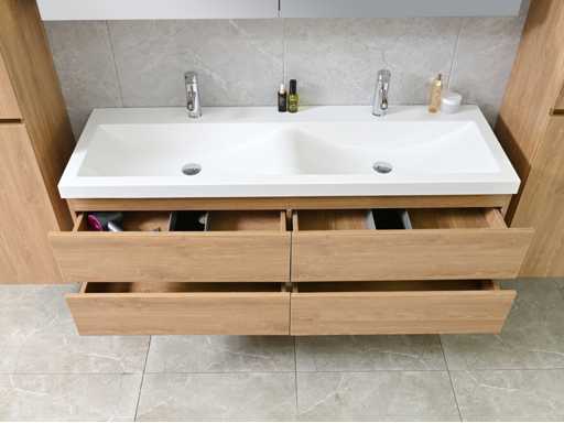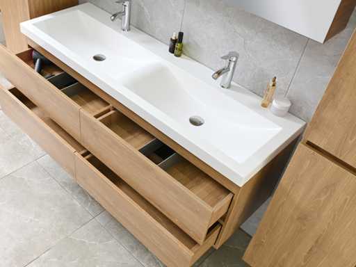 Type: Hawk O. Model: 2-person bathroom furniture 145 cm light - wood decor. Taps: Included. Dimensions: 2-person set: 1 * Washbasin furniture - 1450x480x500mm, 2 * Side cabinets - 1500x350x350mm, 1 * Mirror cabinet - 1400x450x180mm. Equipped with: Faucets including pop-up drain - Softclose drawer system - Resin sinks - Pre-assembled side cabinets and washbasin furniture.