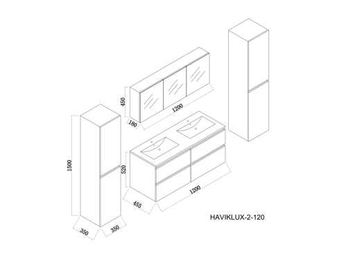 Type: HAVIKLUXWM-2-120-ANT. Model: 2-person bathroom furniture 120 cm - high gloss anthracite with white sink. Size: 2-person set: 1 * Vanity unit - 1200x455x520mm, 1 * Double sink - 1200x460x160mm (edge 2 cm), 2 * Side cabinets - 1500x350x350mm, 1 * Mirror cabinet - 1200x450x180mm. Equipped with: Faucets including pop-up drain - 4 drawers - Soft-close system on doors and drawers - Resin sinks - LED lighting above the mirror - Mirror cabinet with 3 doors and 2 shelves - Pre-assembled side cabinets and washbasin.