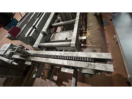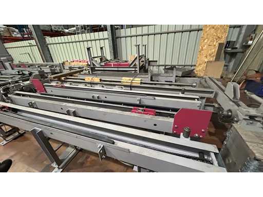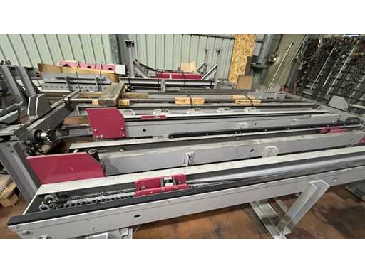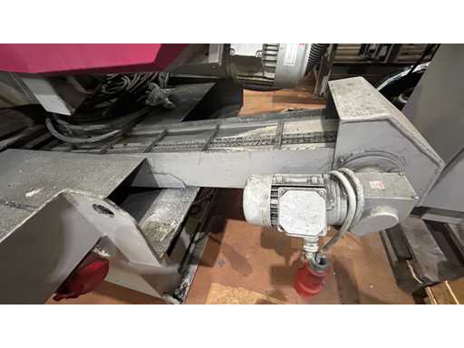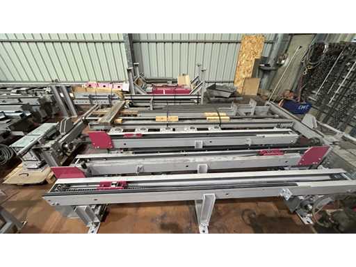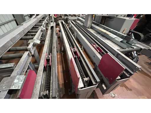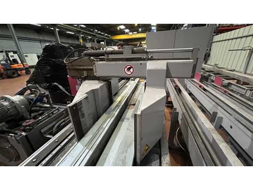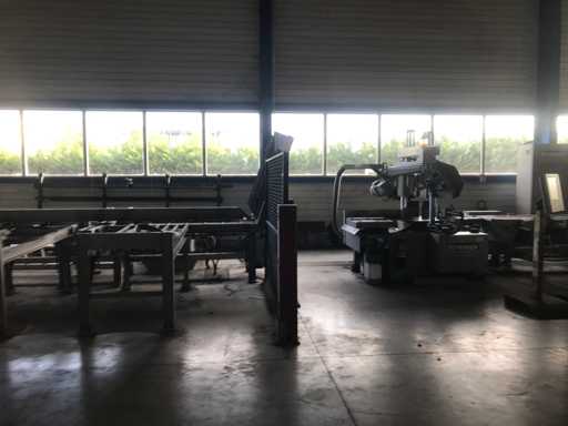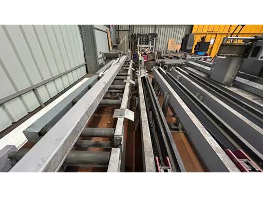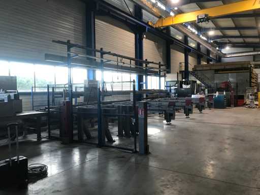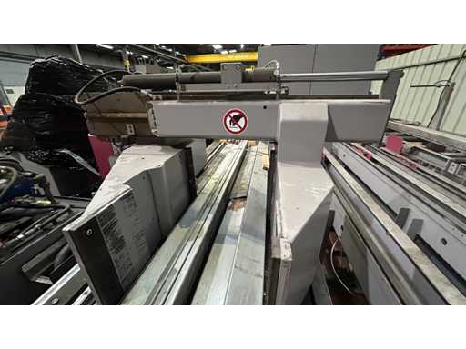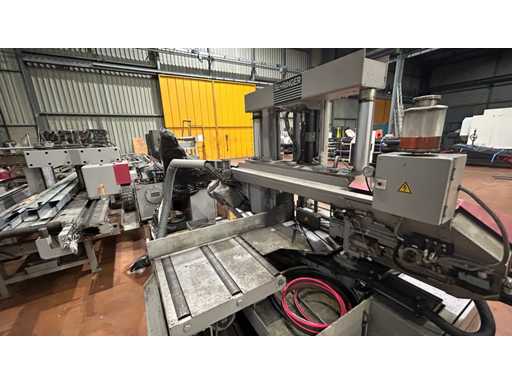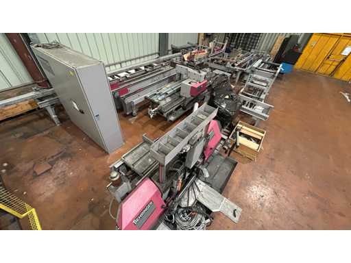 Cutting line for steel frames, equipped with a sliding bench serving as a feeding trolley, a motorised trolley with a stroke of 3 metres, an automatic cutting system with bevel cuts in both directions, as well as a cutting evacuation table. It is a robust line of German manufacture, ideal for cutting metal profiles, tubes and solids, with variable speed control and automatic feed system.