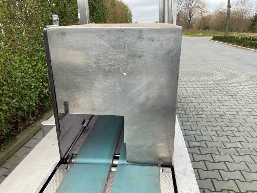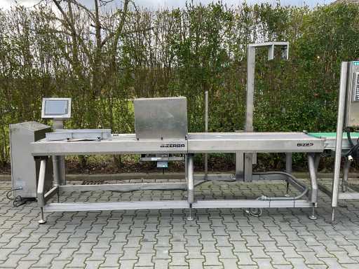 max 6kg; minimum 20g; weighing rate 60m/min; Band width 280mm; equipped with: weighing installation; WEDA Holland scale reading box (maximum 10kg, minimum 250g, e= 5g); infeed belt with automatic shut-off; conveyor belt (width 120mm); Bizerba control box