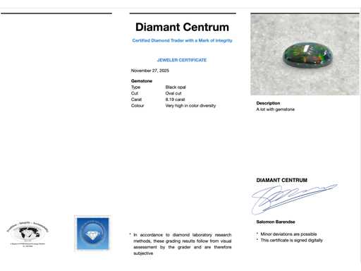 Gemstone: Black opal; Quantity: 1 piece; Cut: Oval cut; Weight (carat): 8.19 carat; Color: Very high in color diversity; Condition: New; Packing: Gem Box; Explanation: The quality has been taken from the report belonging to the item. The valuation is an assessment of a certified diamond dealer, based on consumer prices; Consumer price: € 3,600