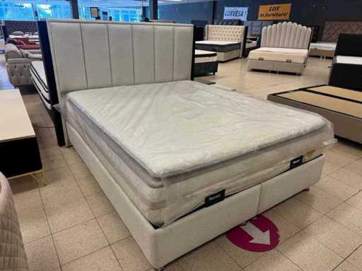Box spring tera size L: 160 cm; W: 200 cm; consisting of: Headboard, boxes with storage space, Luxury mattress with springs included; Color: White Fabric; Condition: Showroom model