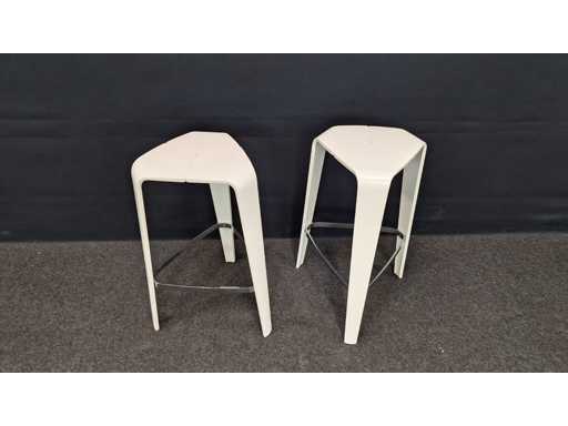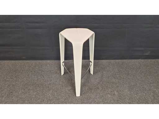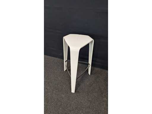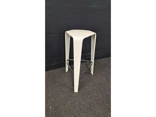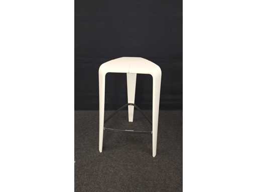4 pieces design bar stool completely in lacquered wood color White, equipped with footrest in metal high gloss chrome-plated, light signs of use possible