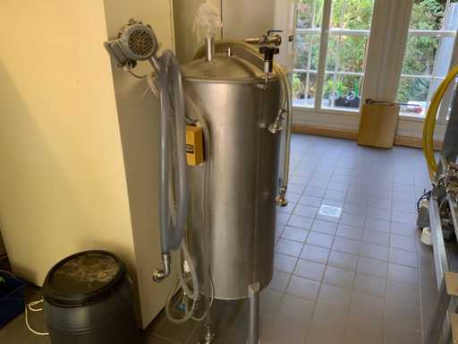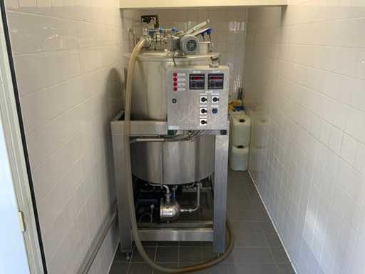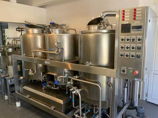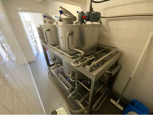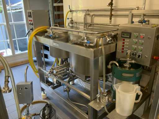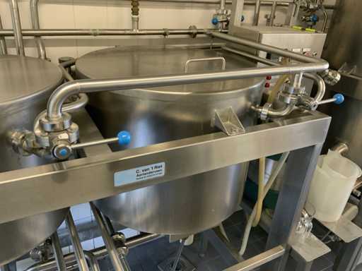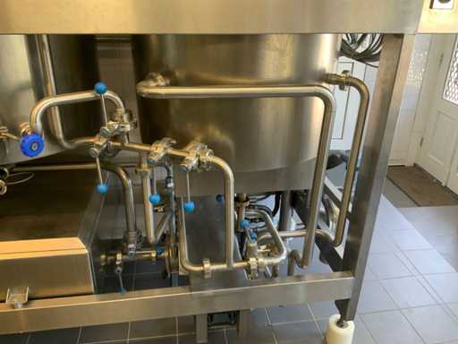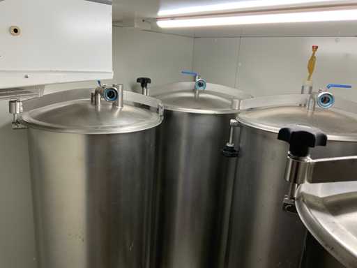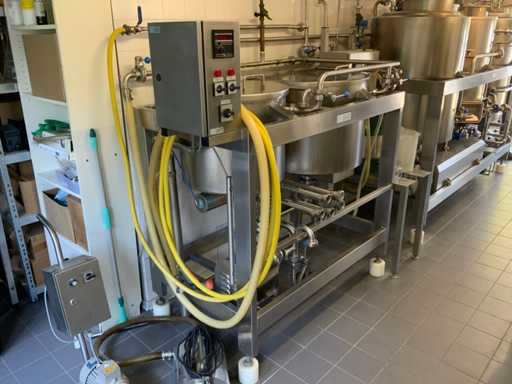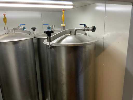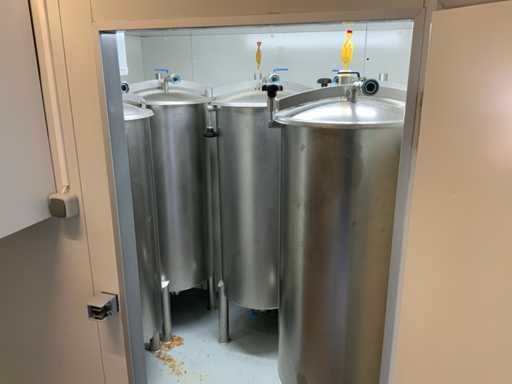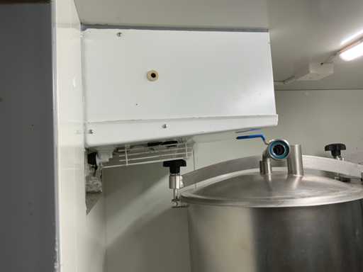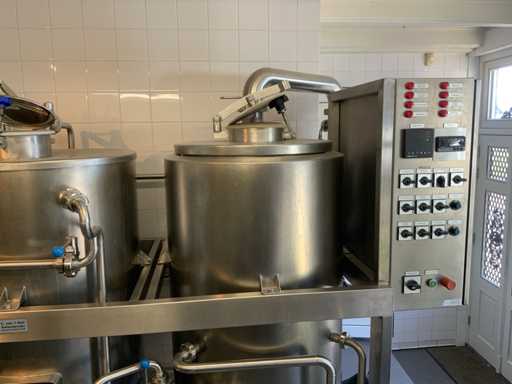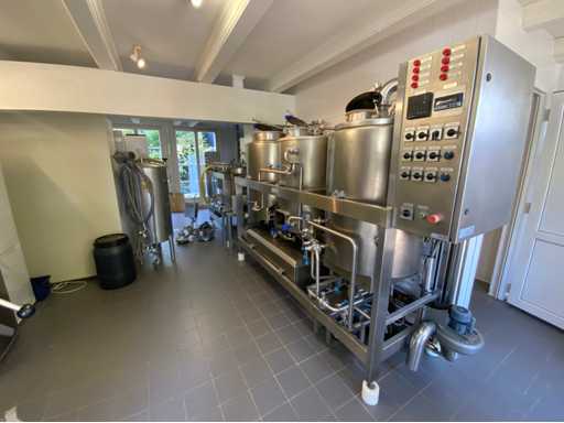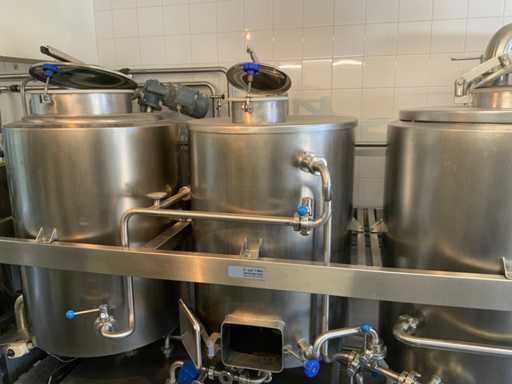 Equipped with cold room with cooling unit "Polar MM 111 SF" (recently replaced, internal dimensions: D1890 x W1920 x H1960 mm); 5 lagering vessels of 200 L; 1 filling vessel of 200 L with stirring mechanism driven by Nord SK 64L/4 engine (0.18 kW); Rotor pump for filling beer kegs; extra pump from C. van 't Riet for transport of main fermentation liquid to lager vessels; complete brewing installation type 9711000116, year of construction 1997 (920x3000x2100 mm); mash tun 250 L with Nord agitator and indirect heating via double-walled water storage (2 x 6 kW heating elements, expansion to 18 kW possible); 250 L flush filter kettle with perforated filter plate, arrow glass, back-filter mechanism, cleaning hatch (235x185 mm); boiling kettle 250 L with oil-filled double-walled heating (2 x 6 kW + expandable), insulated lid with spray ball and stainless steel NW100 condensation pipe, fan and water nebulizer; 157 L collection and outlet container with sloping bottom, NW50 spout; control cabinet with digital temperature control and software; CIP unit type 0001000418, year of construction 2000 (890x1610x1710 mm), with two stainless steel cleaning boilers of 100 L each, double wall with indirect heating (2 x 6 kW), FP4600 cleaning pump, separate stainless steel control box and full piping set; Yeast installation type 9711000216, built in 1997 (1100x2300x1900 mm); two double-walled main fermenters of 280 L with cooling water circulation, agitator, spray ball and aeration pipe; plate cooler type Sigma 7 (300 L/h capacity, 7000 L/h cooling water); chiller model TEA 081 (cooling capacity 27 kW, 1650x743x1350 mm, max. 8 kW); 2 plate heat exchangers type 410/40; 2 stainless steel frames, adjustable in height; extensive stainless steel piping including butterfly valves, T-pieces, point pieces, cooling pipes and sight glass; digital pH meter HI9024; insulated grow box with ventilation and temperature control (440x640x480 mm); thermostatic mixer (50–90 °C, with thermometer connection); Water meter with electronic readout and optional PC connection.