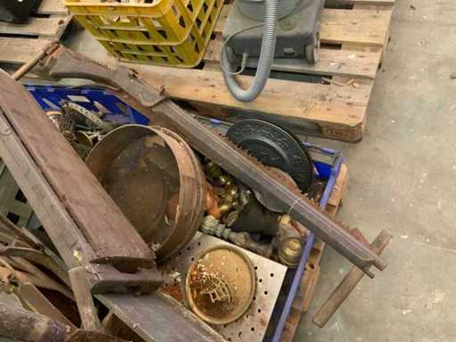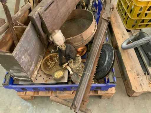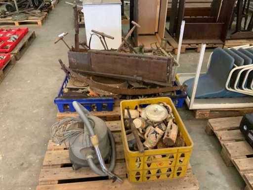 including: beer mugs, snake drills, 1 tree saw, 1 brick molding box, 1 rifle, 1 sieve, various plates. including 1 DIBO vacuum cleaner