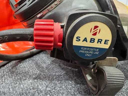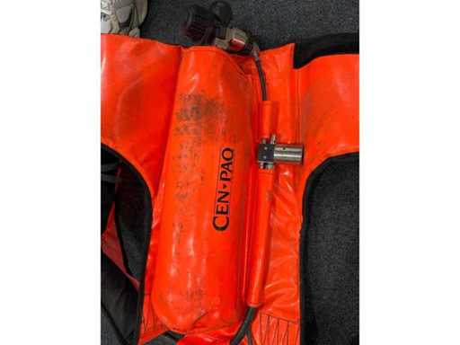 Complete respiratory protection system consisting of CEN-PAQ buoyancy compensator with integrated compressed air cylinder and SABRE full face mask (CE 0194). Designed for use under overpressure conditions. Bottle with pressure indicator, mask with carrying harness. Signs of wear visible, functional according to customer statements. Ideal for exercise, training or emergency equipment.