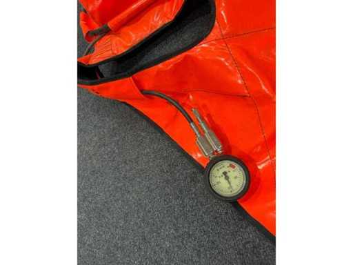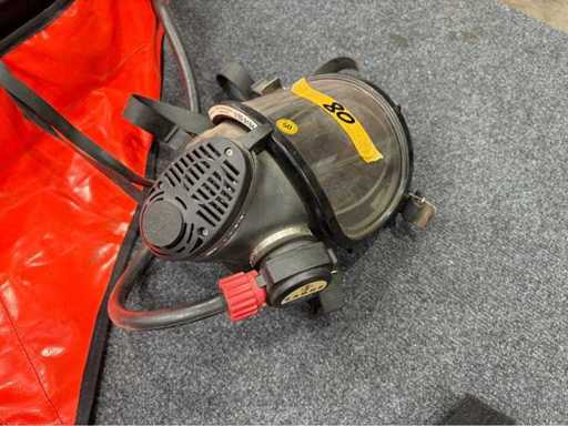 Complete emergency respiratory protection system with integrated air bottle, pressure reducer, pressure gauge and full face mask with CE certification. System for overpressure operation. Pressure gauge up to 300 bar. Visual inspection was last in 2005.