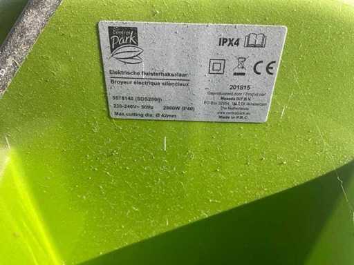 Electric whisper shredder from the brand Central Park, model SDS2806. Power: 2800W. Maximum branch diameter 42 mm. Voltage: 220-240V~50Hz. Protection class: IPX4 (splash-proof).
