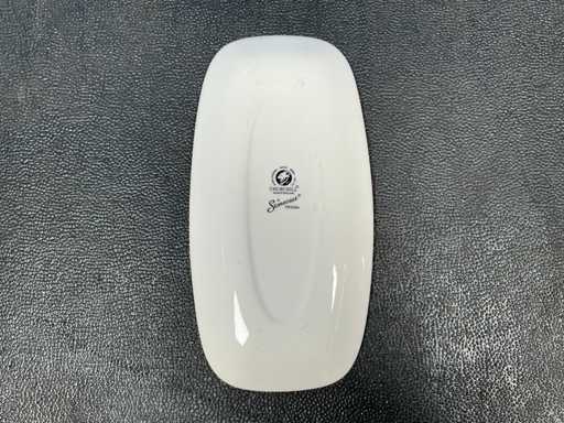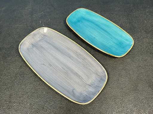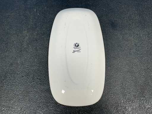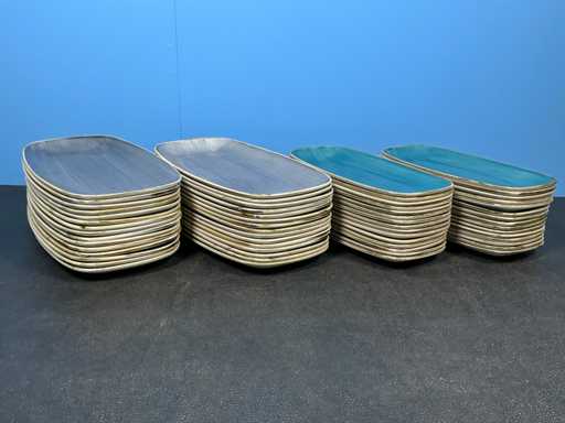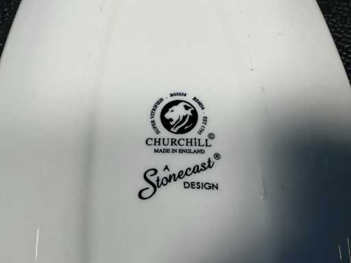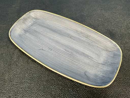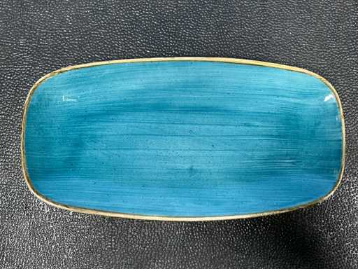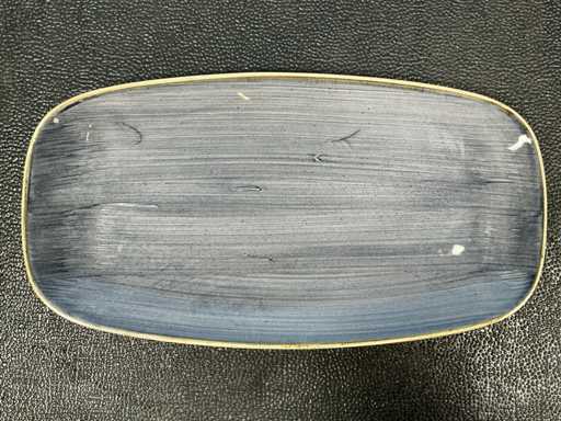 Consisting of: 30x Churchill Stonecast Chefs oblong plate Blueberry 35.5x19cm, 30x Churchill Stonecast Chefs oblong plate Java Blue 30.5x15.3cm. In and with 2 crates.