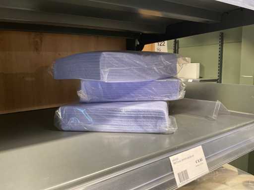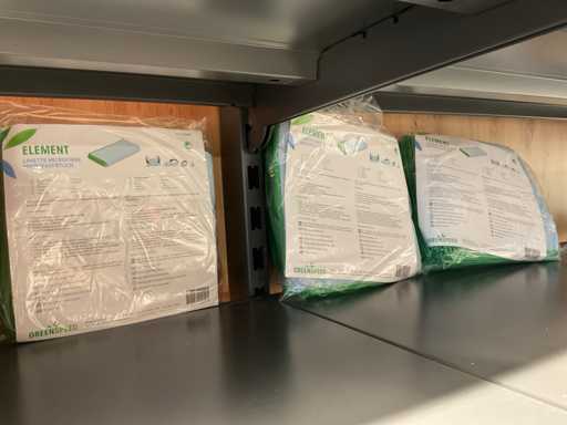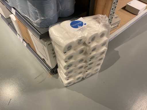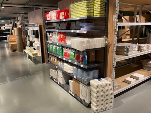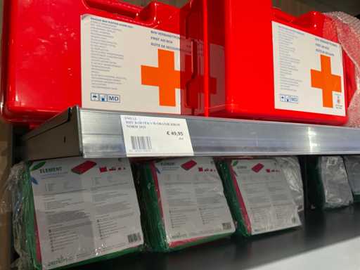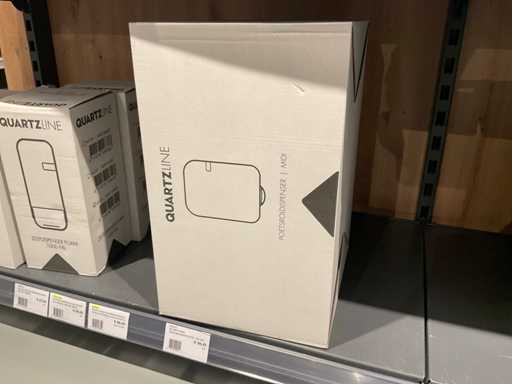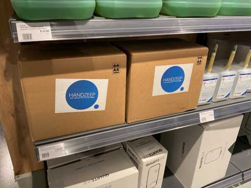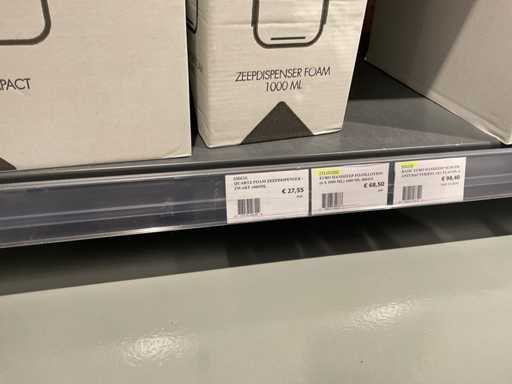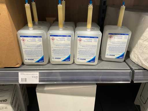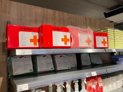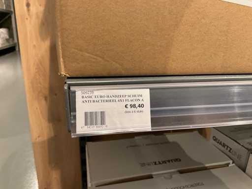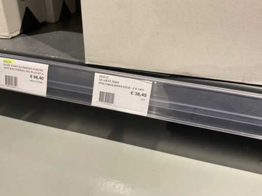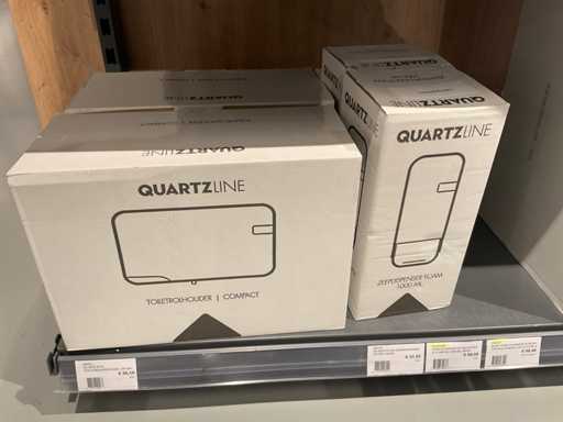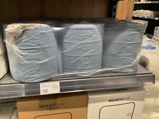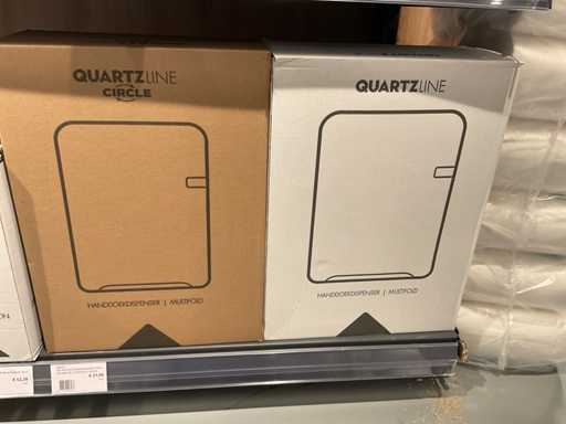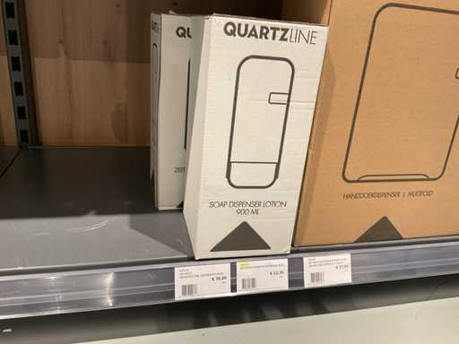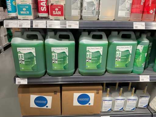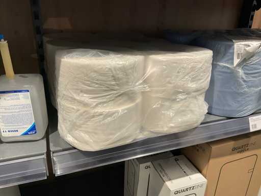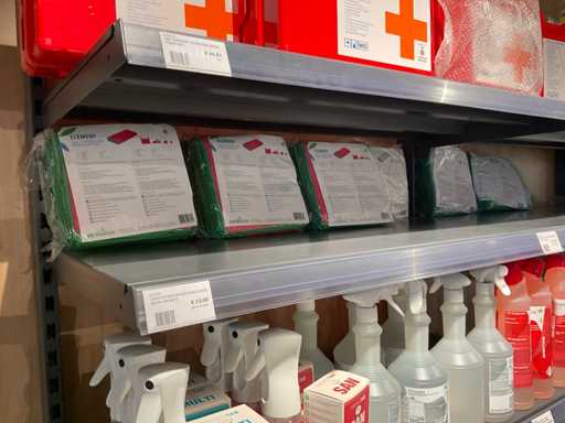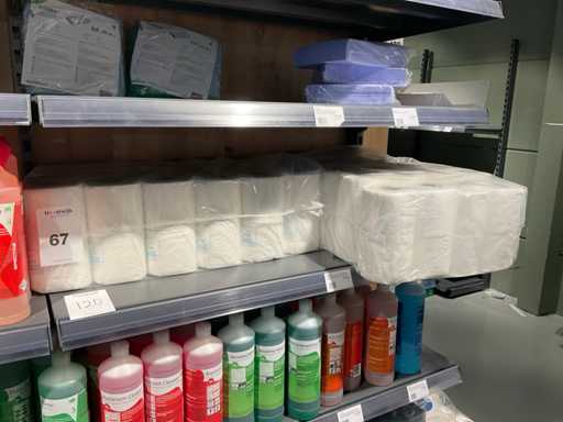 Batch of cleaning products including microfiber cloths, toilet rolls, floor cleaner, sanitary cleaner, cleaning rolls, hand soap, various quartzline dispensers and 4x emergency response kit. Excluding rack