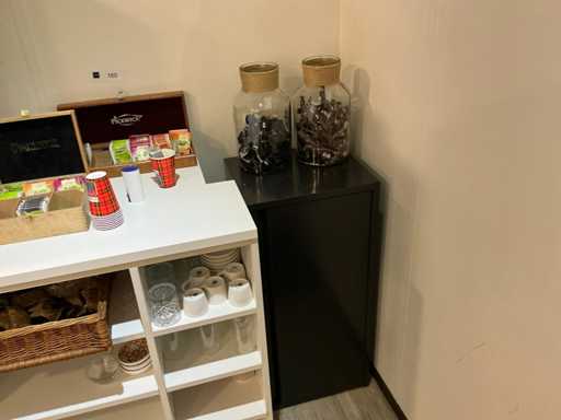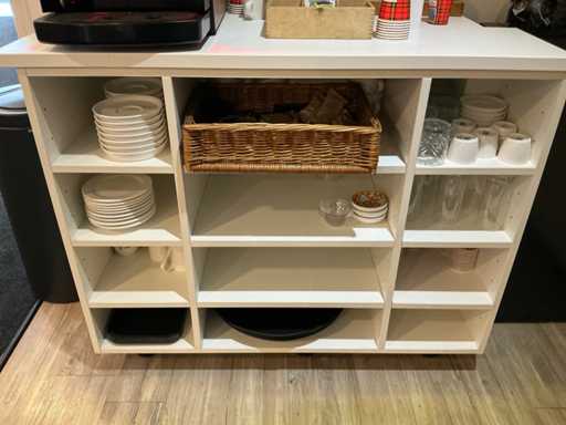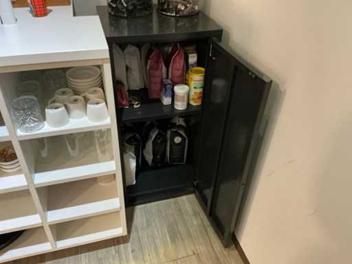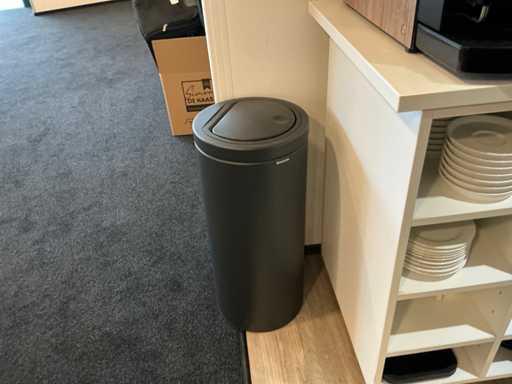 With coffee and tea accessories and cabinet and Brabantia trash can next to the furniture