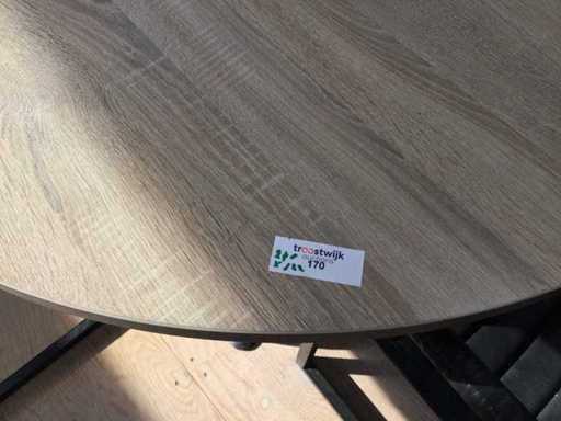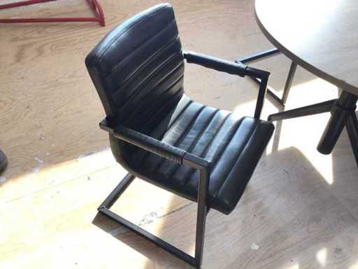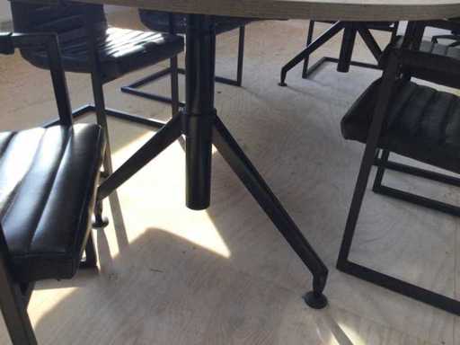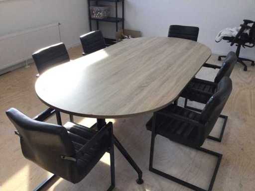 Set consisting of a large oval conference table with six matching conference chairs. The table has a wood-look top and a black metal base. The chairs are made of black faux leather with a metal frame and armrests. Table dimensions: approximately 240 × 122 cm. Suitable for use in the office, meeting room or workplace.