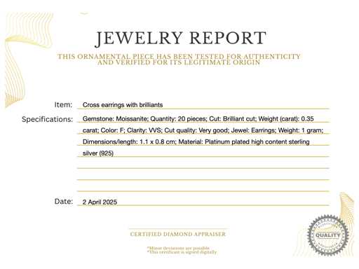 Gemstone: Moissanite; Quantity: 20 pieces; Cut: Brilliant cut; Weight (carat): 0.35 carat; Color: F; Purity: VVS; Cut quality: Very nice; Jewel: Earrings; Brand: Harmony; Weight: 1 gram; Dimensions/length: 1.1 x 0.8 cm; Material: Platinum grade high grade sterling silver (925); Condition: New; Packing: Jewelry box or velvet case; Explanation: The quality has been taken from the report belonging to the item. The valuation is an assessment of a certified diamond dealer, based on consumer prices; Additional information: The measured weight of the gemstones is according to diamond sizes; Consumer price: € 400,-
