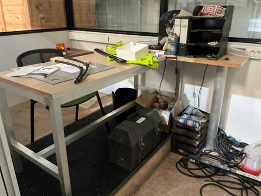 Equipped with lighting and door, Complete with contents being aluminum desk, side chair and 2-drawer cabinet and various lacquers and spray cans