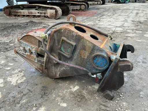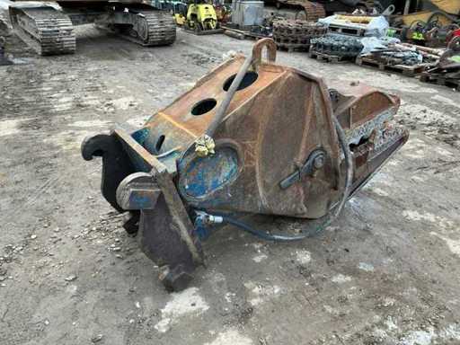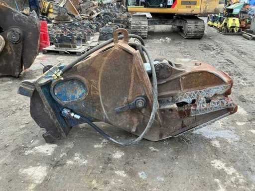 Heavy-duty hydraulic demolition attachment, suitable for excavators. Designed for crushing reinforced concrete and structural elements. Robust steel construction with hydraulic cylinder drive and replaceable crushing teeth.