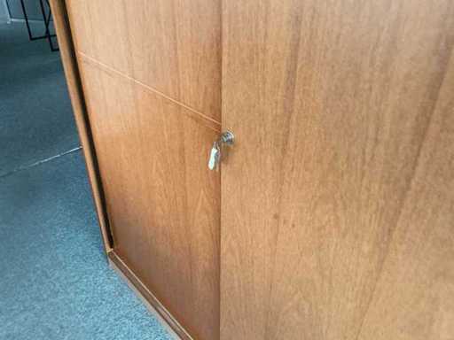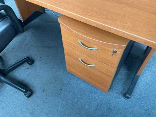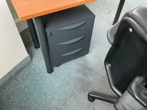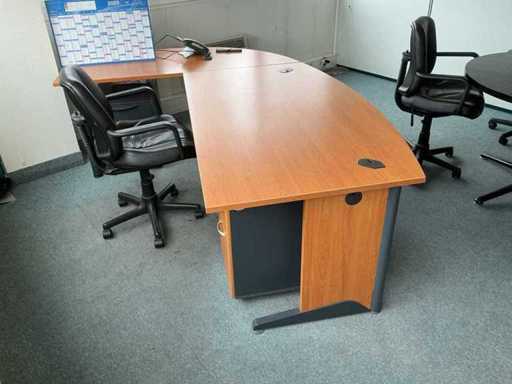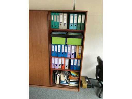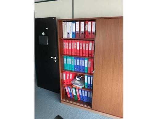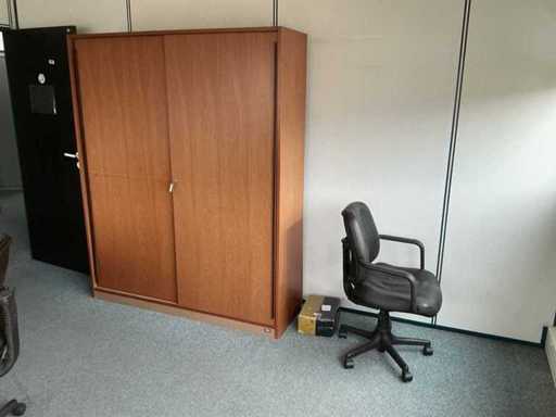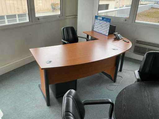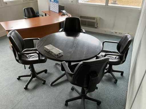 Comprising: six armchairs, a round table with a diameter of 120 cm, an L-shaped desk with two mobile pedestals (230x170x 75cm), a tall wardrobe (158x45x195 cm). Sold without content