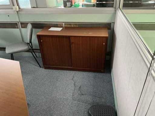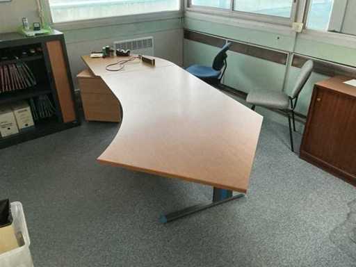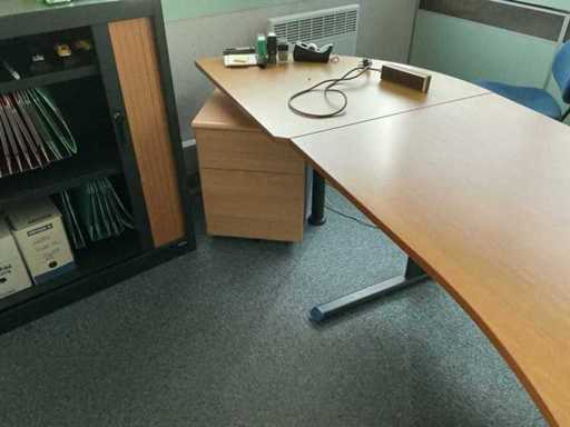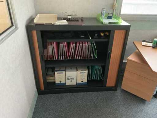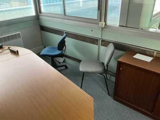 Comprising: two chairs, a low cabinet with sliding door (121x45x105cm), a low cabinet, a desk (280x113x72cm), a mobile pedestal. Sold without content