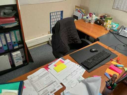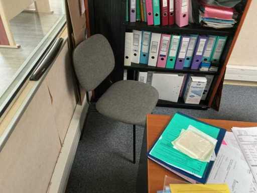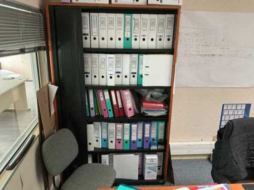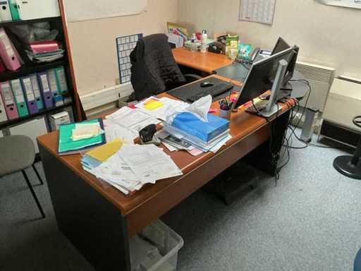 Including: two chairs, a sliding door cabinet (121x45x195cm), an L-shaped desk (250x170x74cm), a mobile pedestal. Sold without content
